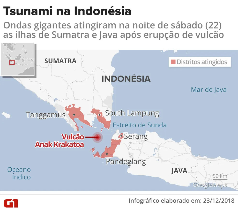O vulcão Anak Krakatoa está situado no chamado Cinturão de Fogo, na região do Pacífico que concentra uma grande quantidade de vulcões ativos e atividades sísmicas. A 29 de dezembro de 1927, Anak Krakatoa ou "criança de Krakatoa" emergiu da caldeira formada em 1883 pela erupção vulcânica explosiva que destruiu a ilha de Krakatoa.